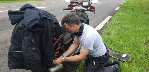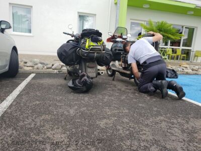 Next day we made a decision to do all of the return on A and B roads to make the trip a little more interesting rather than using boring French motorways. We left the hotel and after only about 15 miles, Russ while riding right next to me holed his piston, again we looked around and found ourselves in the middle of nowhere.