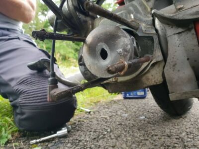Rain was coming in as we stripped his top end off to replace it with his spare TS piston, due to the rain making us keep stopping to shelter this pit stop took nearly 2 hours before we were on our way again.