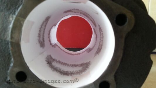 The first thing I did was order a new Wosnner piston in the same 71mm size, I didn’t want to re-bore the barrel even though it needed a re-bore due to the scoring that had been there for years. Then I set about making traces of the barrel to decide what metal I needed to take out to get the port shape I was after.